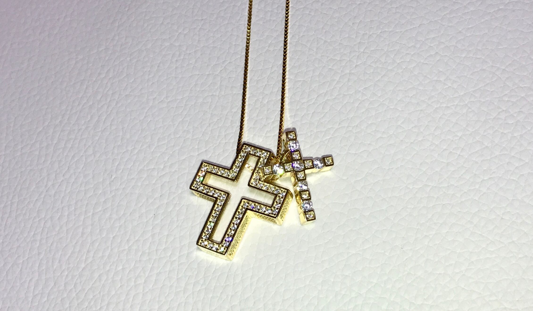 珍しいベネチアンチェーンも使用されており、真ん中のクロス部分は取り外しが可能で、色々なパターンを出せるお洒落なジュエリーになっております。