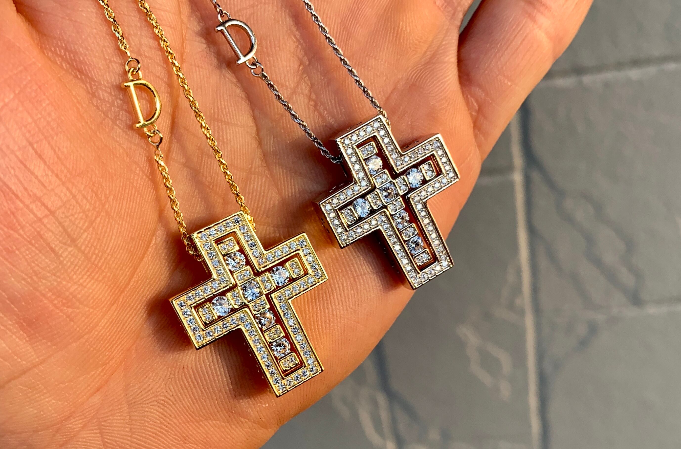 当店オリジナルのDの文字が付けられたチェーンの中で一番人気スクリューチェーンを使用されており、真ん中のクロス部分は取り外しが可能で、色々なパターンを出せるお洒落なジュエリーになっております。