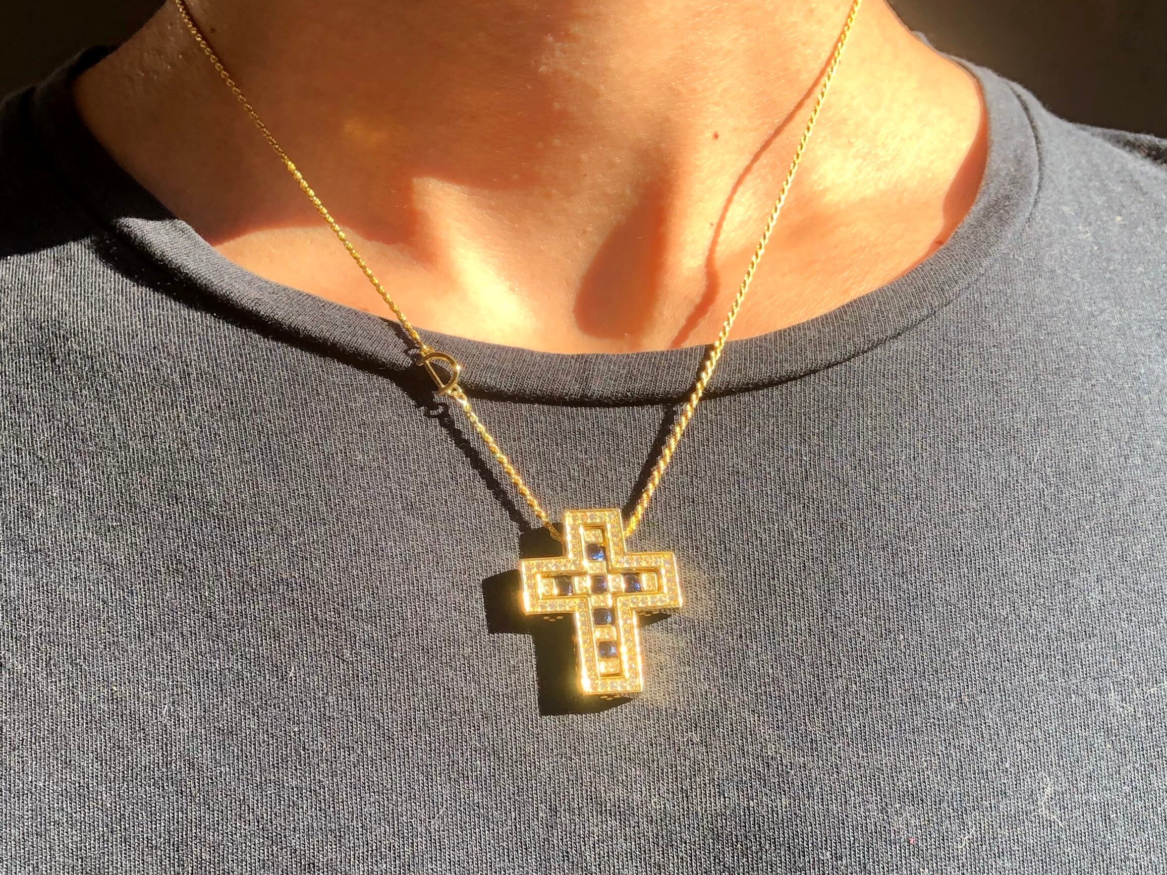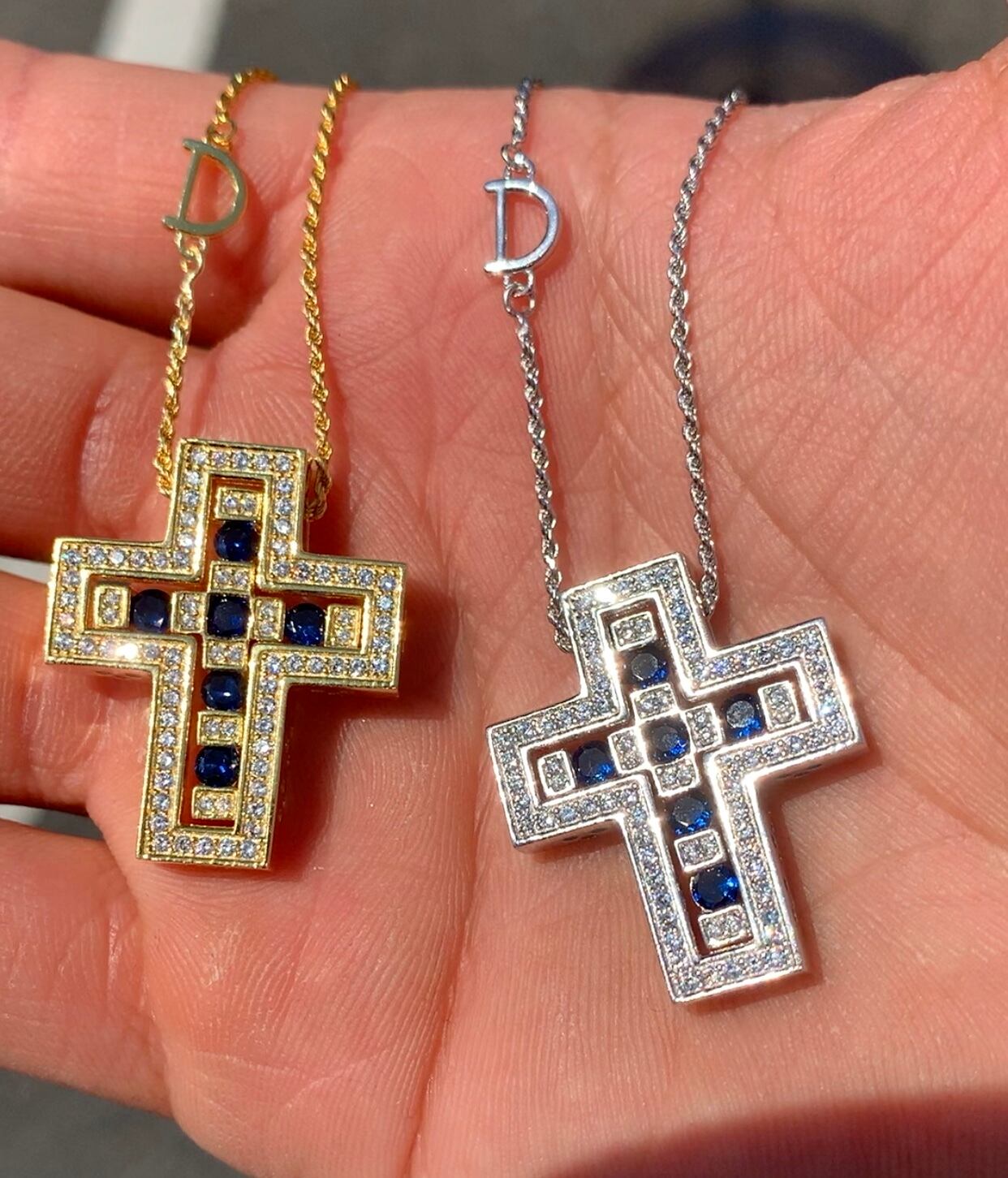 当店オリジナルのDの文字が付けられたチェーンの中で一番人気スクリューチェーンを使用されており、真ん中のクロス部分は取り外しが可能で、色々なパターンを出せるお洒落なジュエリーになっております。